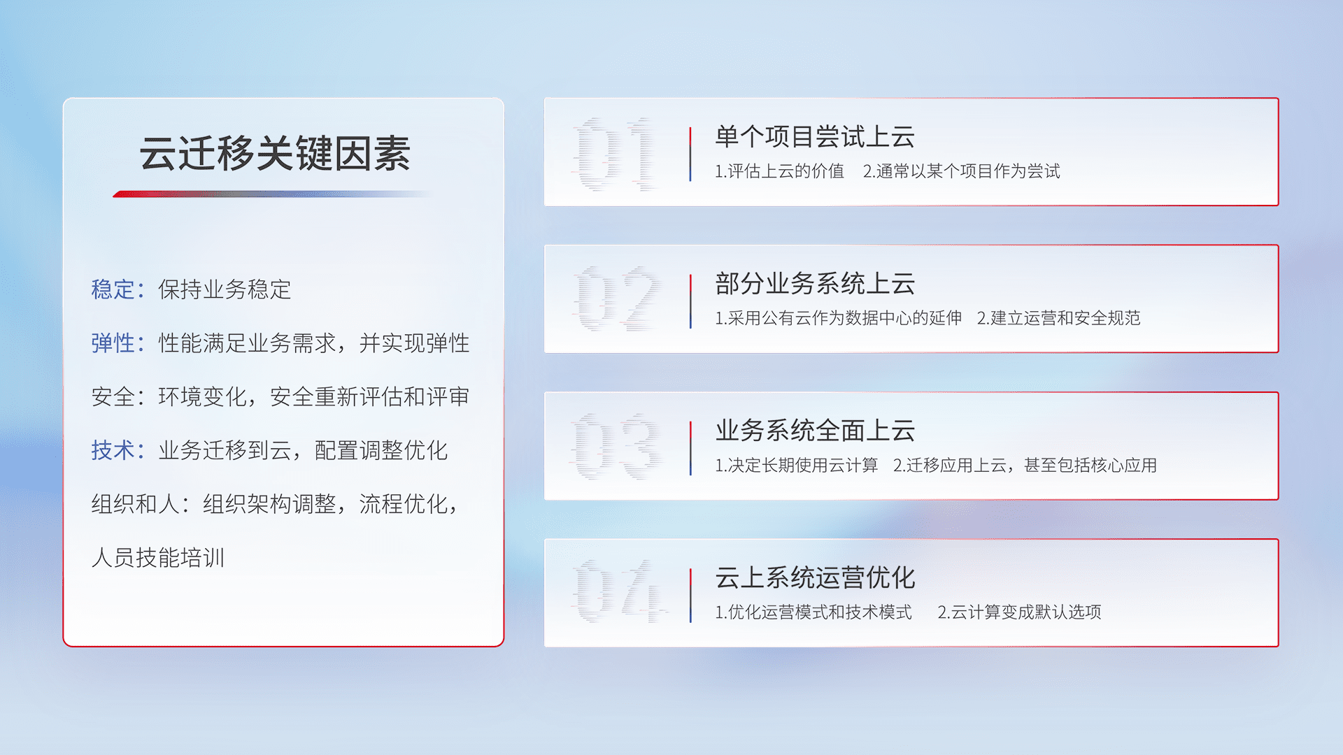 结合实际业务,,,从规划设计、、、云平台选型、、、、云原生改造、、数据迁移、、集成交付,,,迁移全过程为客户识别最佳上云路径,,做好风险识别管理,,,设计网络架构、、身份权限、、、、安全审计合规、、、、操作审计、、、、日志审计、、、监控告警策略、、多站点容灾设计等,,,,对云上基础设施进行整体规划,,,提升IT治理水平,,,以满足弹性、、高可用、、、高性能的需求。。。